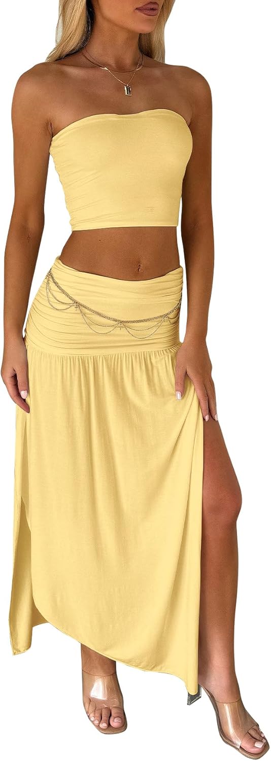 Two Piece Skirt Set for Women - 2 PC Summer Beach Vacation Outfits Going Out Strapless Tube Crop Tops Boho Maxi Skirts Sets
