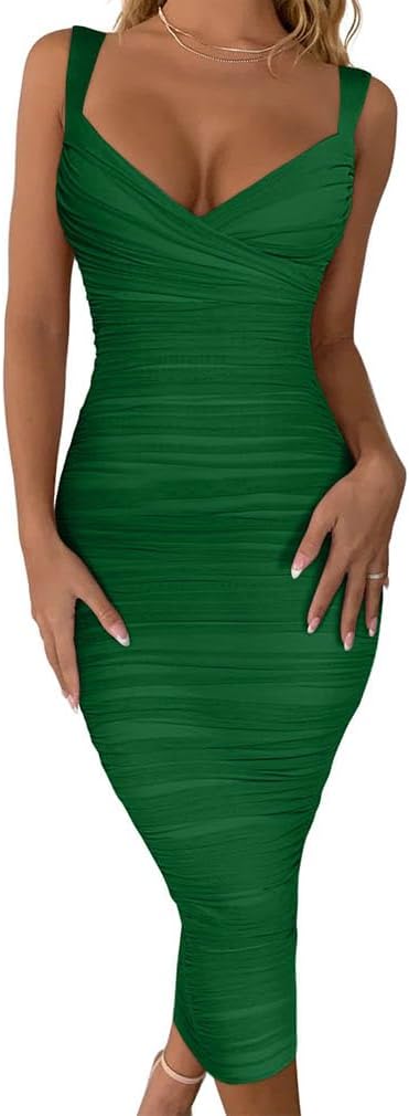 BEAGIMEG Women's Sexy Bodycon Sleeveless Ruched Mesh Club Party Midi Dress