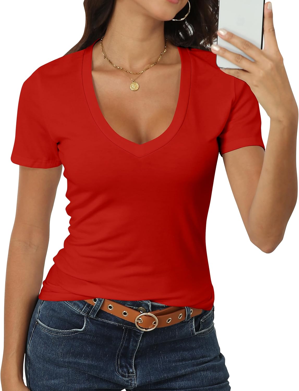 Roselux Women Short Sleeve Deep V Neck Tops Shirts Fitted Cotton Summer Tshirt Tee
