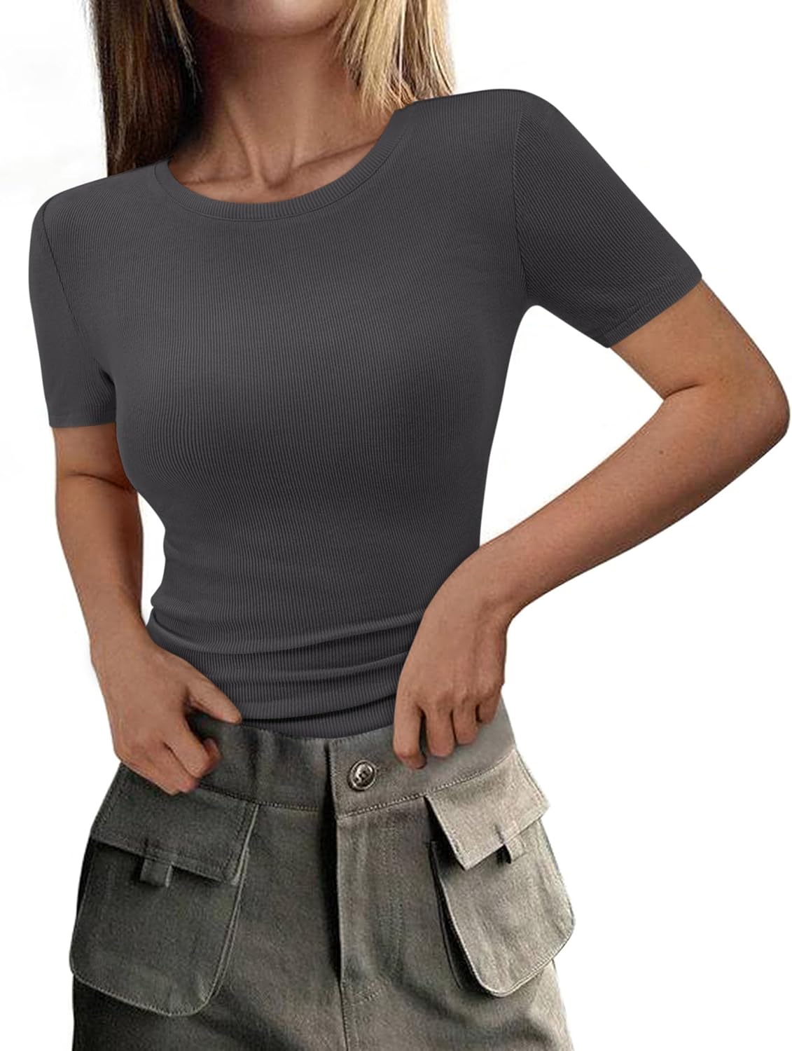 PRETTYGARDEN Women 2026 Summer Crew Neck Short Sleeve Tops Ribbed Knit Slim Fit Fashion Basic Tee Shirts Casual Going Out Top