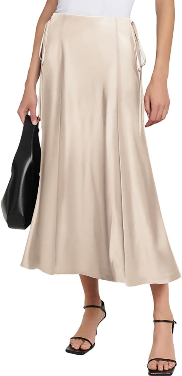 SEBOWEL Women Satin Maxi Long Skirt Silk Side Tie A Line Swing Midi Skirt Silky Flowy Ruffle Pleated Cocktail Party Skirts