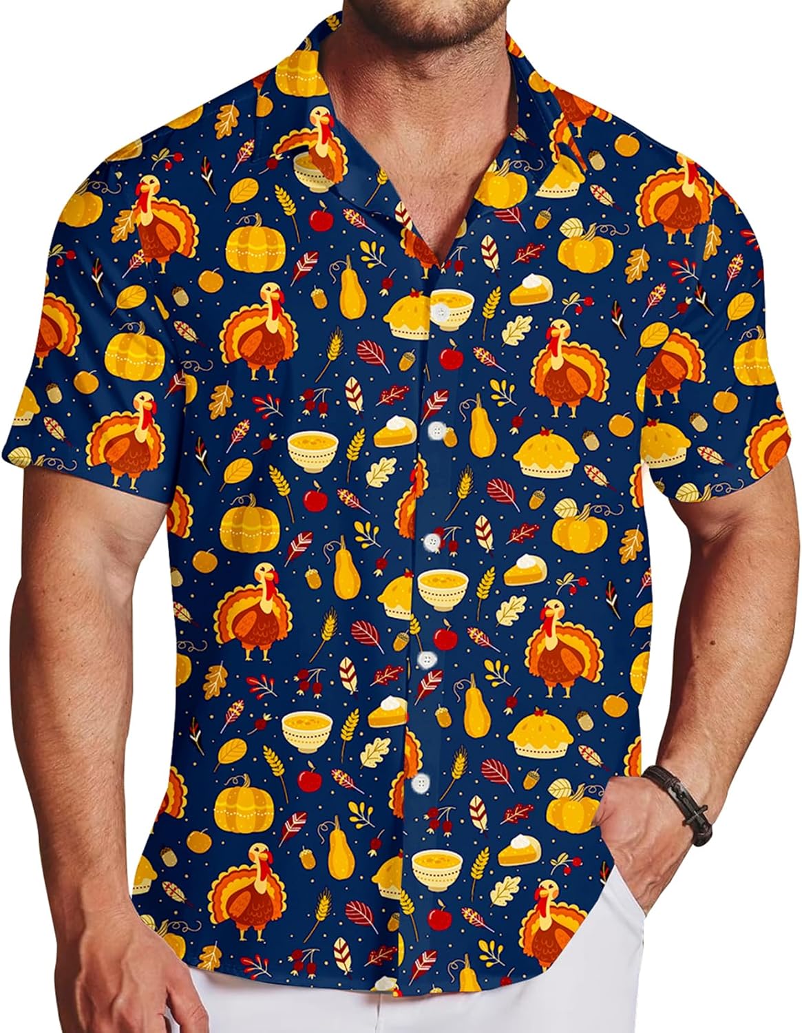 Mens Thanksgiving Button Tops Short Sleeve Turkey Hawaiian Shirt