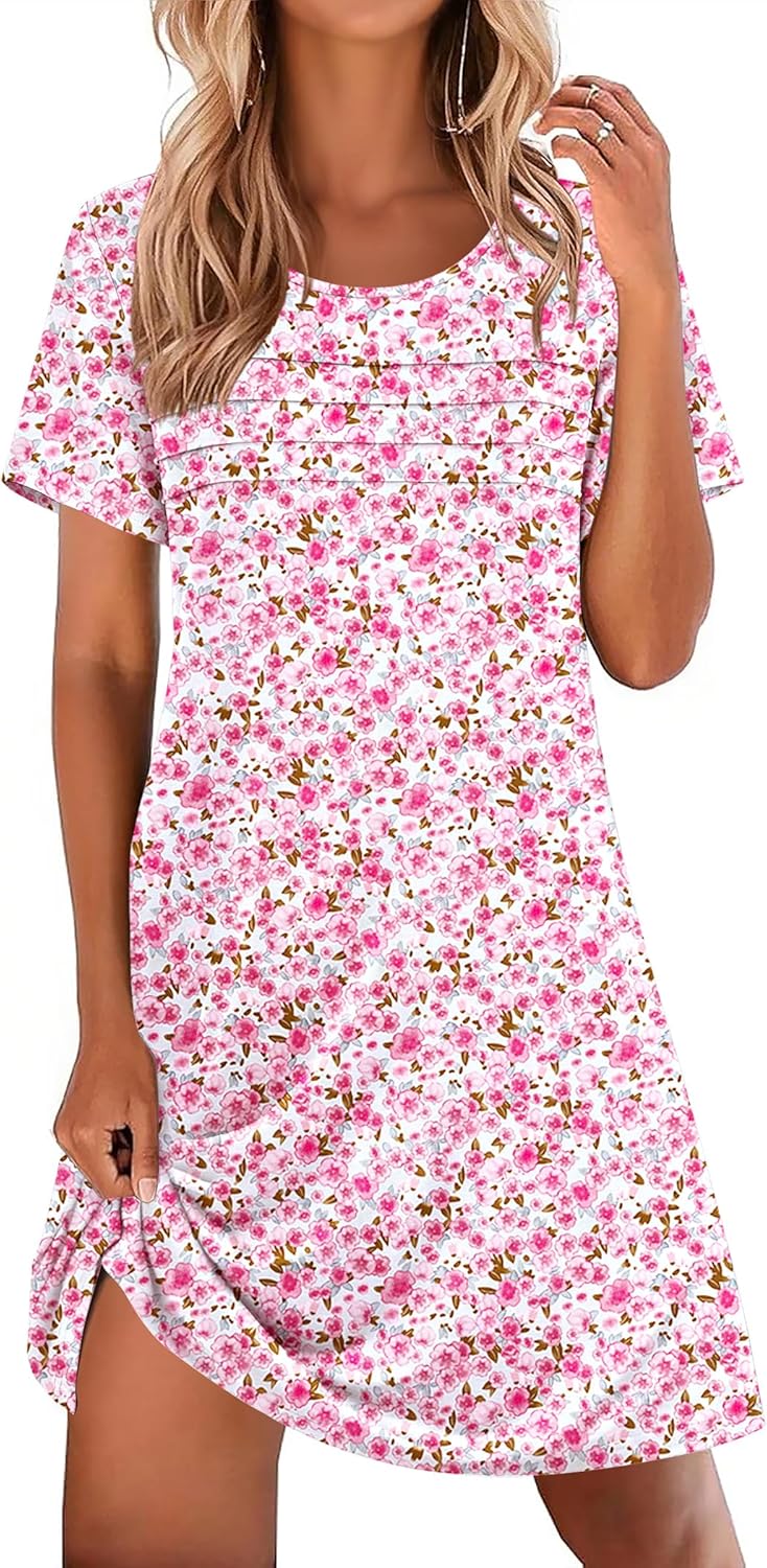 Ekouaer Cotton Nightgowns for Women Short Sleeve Sleep Shirts Pleated Night Shirts Soft Crew Neck Night Gown
