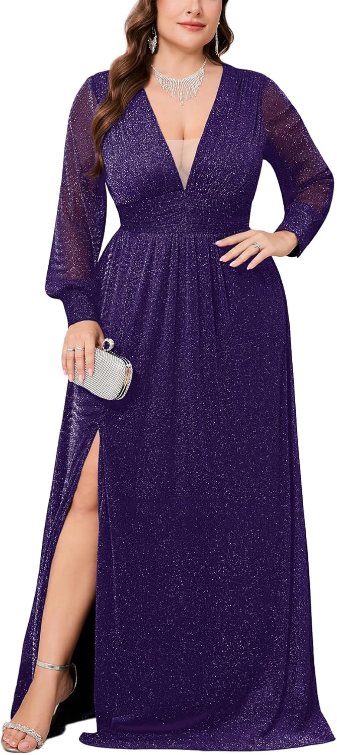 Plus Size Sparkly Formal Maxi Dress Long Sleeve Deep V-Neck Mesh Dresses with Slit Cocktail Wedding Evening Gown
