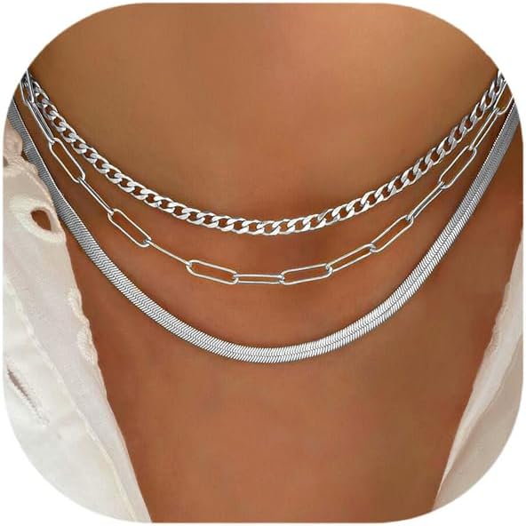 Gold Layered Necklaces for Women, 14K Gold Plated Dainty Gold Chain Choker Necklace Stack, Herringbone Gold Necklaces Set