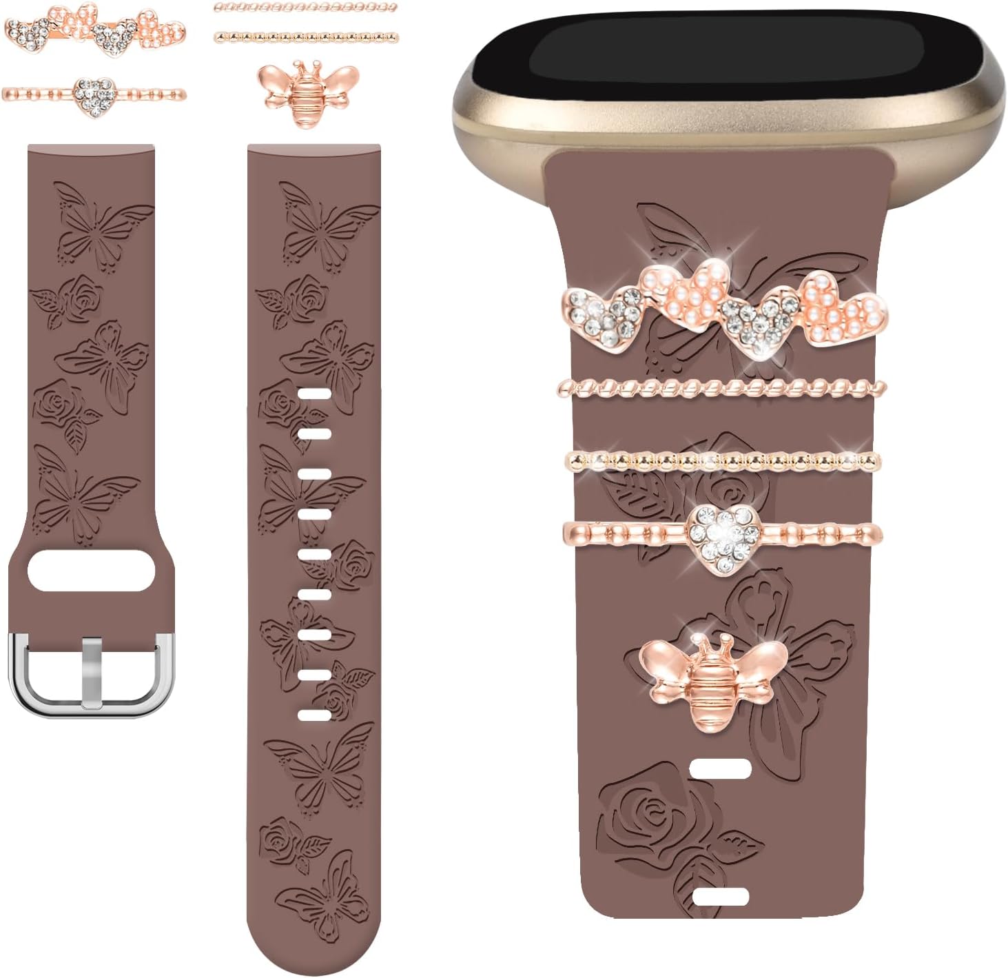 Watbro Floral Engraved Band and Decorative Rings Loops Compatible with Fitbit Sense/Sense 2/Versa 3/Versa 4 Bands Women,Silicone Replacement Band for Fitbit Sense/Sense 2/ Versa 4/ Versa 3 Smartwatch