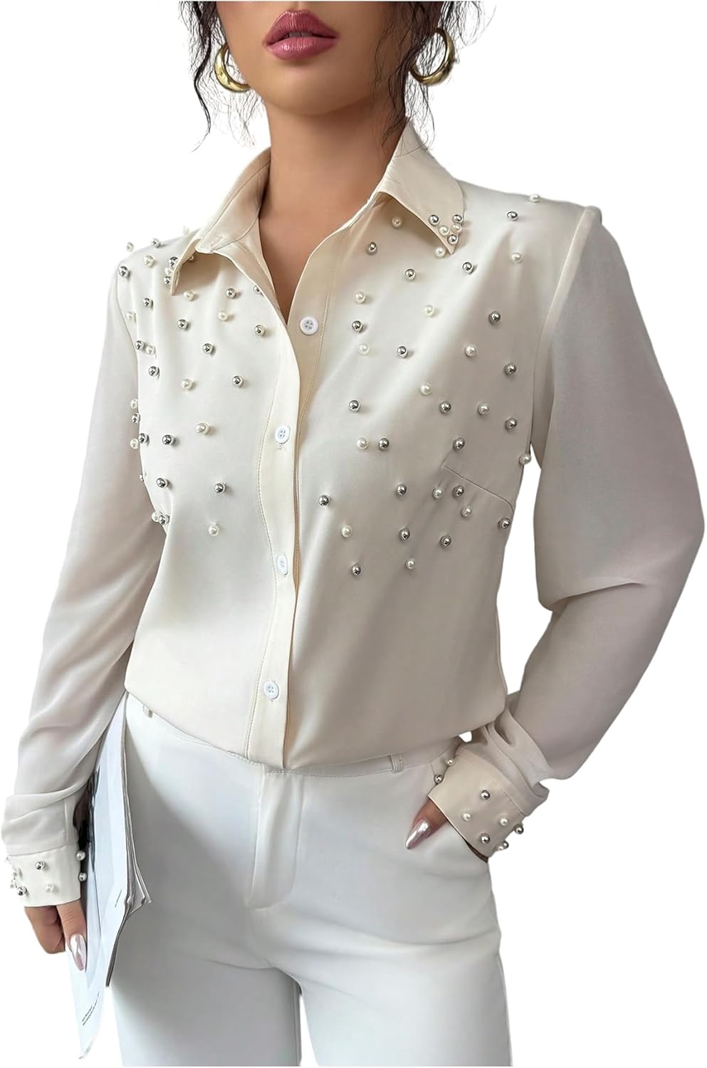 SweatyRocks Women's Pearl Elegant Tops Button Down Shirts Long Sleeve Work Office Blouse