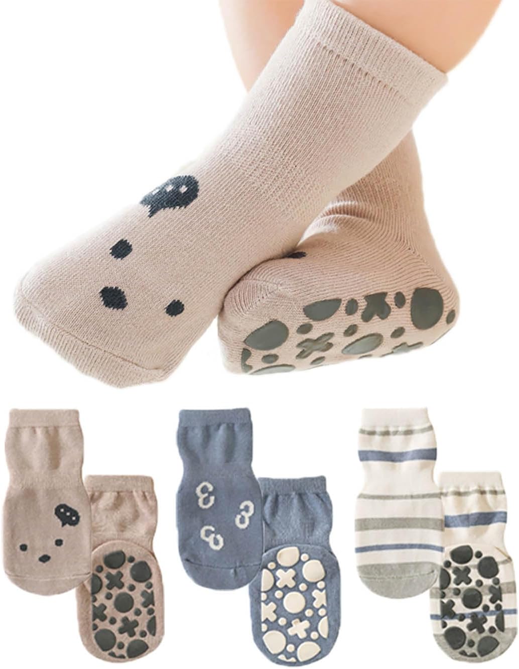 Woeoe 3 Pairs Baby Socks with Grip Cute Pattern Non-slip Toddlers Socks for Kids Girls Boys (1-3 Years Old )