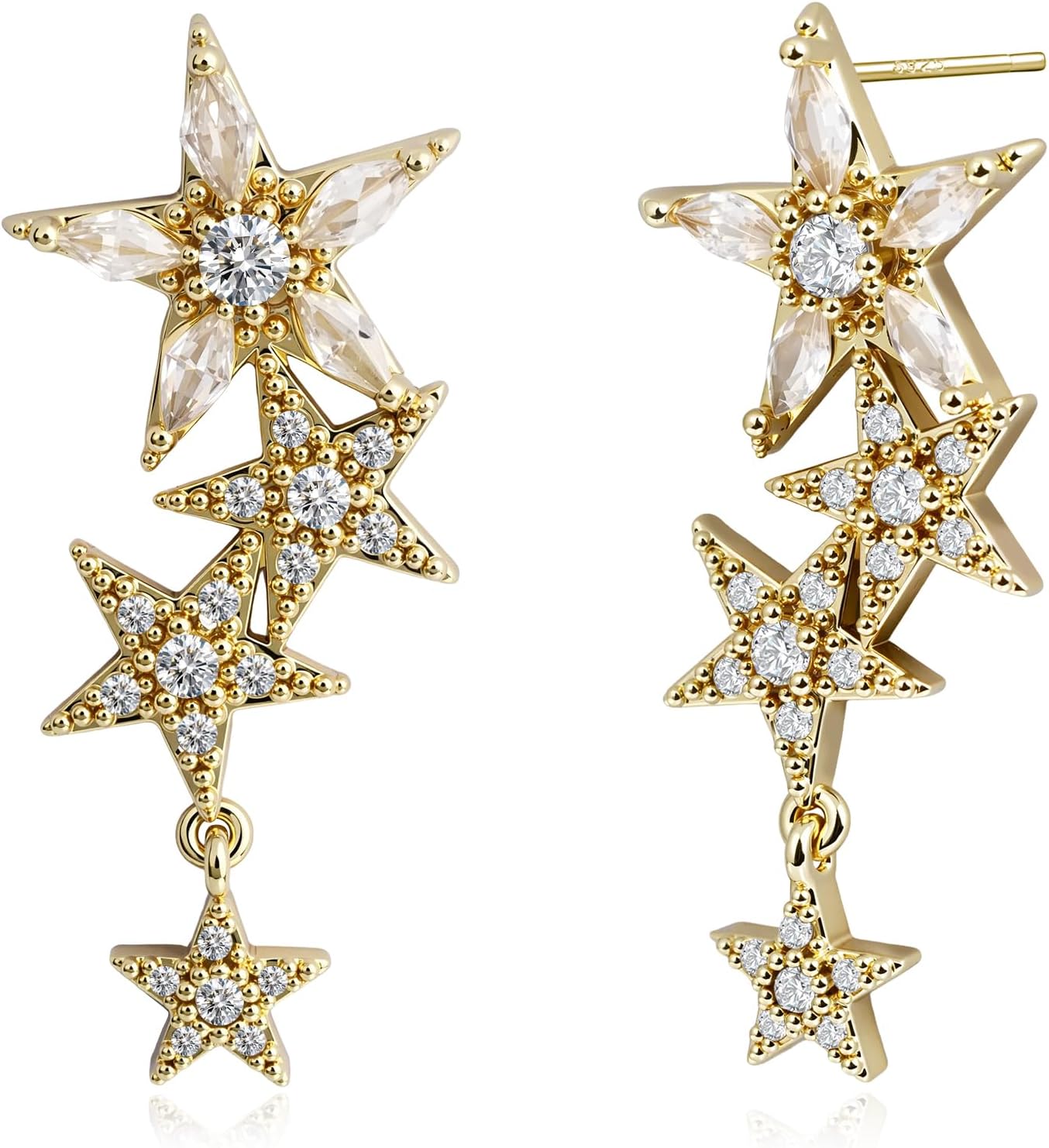 14K Gold Plated Star Earrings for Women, 4 Star Cubic Zirconia Dangle Earrings Hypoallergenic Gold Jewelry for Women
