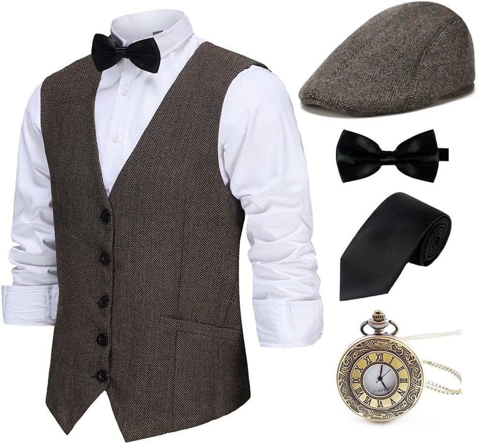 Gionforsy 1920s Mens Costume Gatsby Gangster Vest Fedora Hat Suspenders Bow Tie Costume Accessories Set