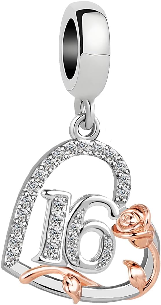 KunBead 12 13 16 18 21 30 40 50 60 70 Birthday Rose Heart Dangle Charms Compatible with Pandora Bracelet Necklace for Women