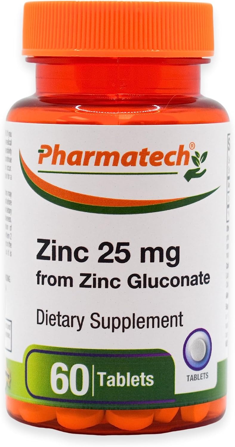 Zinc Gluconate 25 mg Chelated Elemental Zinc, Immune Support Supplement Mineral Antioxidant for Vegetarians, Acne, Easy to Swallow, 60 Tablets, by Pharmatech®