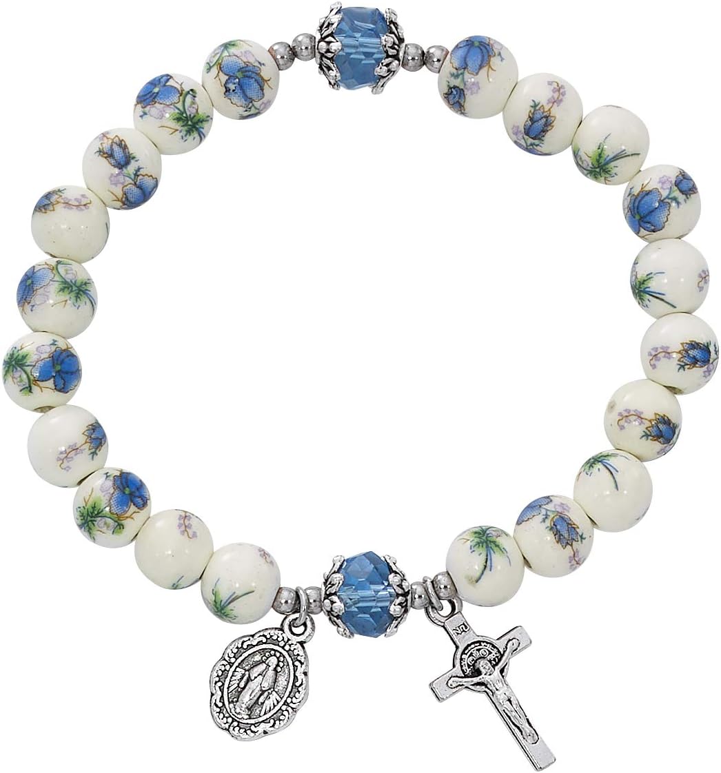 Blue Ceramic Stretch Rosary Bracelet With Miraculous Medal and Crucifix