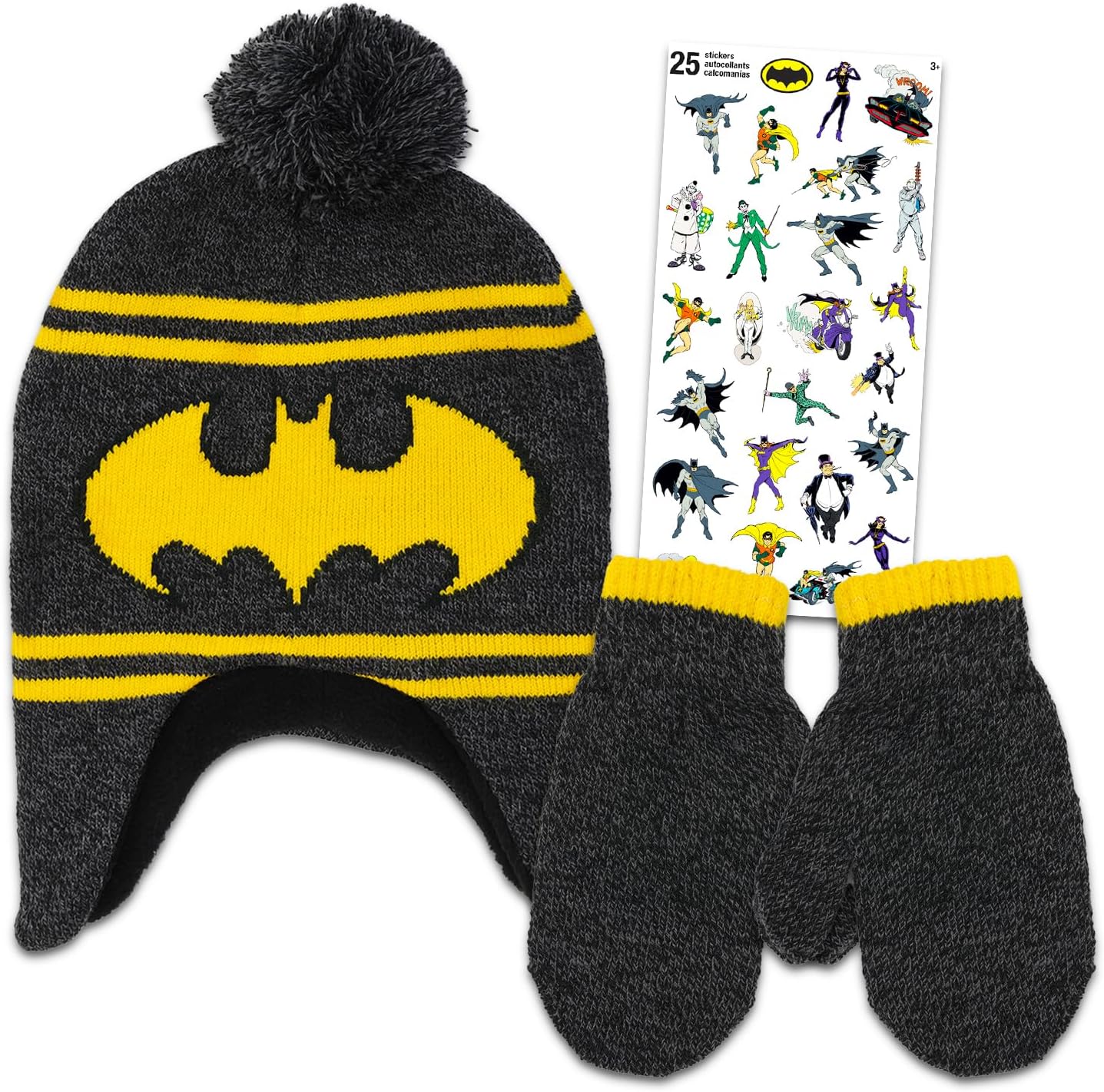 Batman Winter Hat and Mittens Set - Bundle with Knit Beanie and Mittens for Cold Weather Plus Stickers | Winter Gear Gifts for Kids