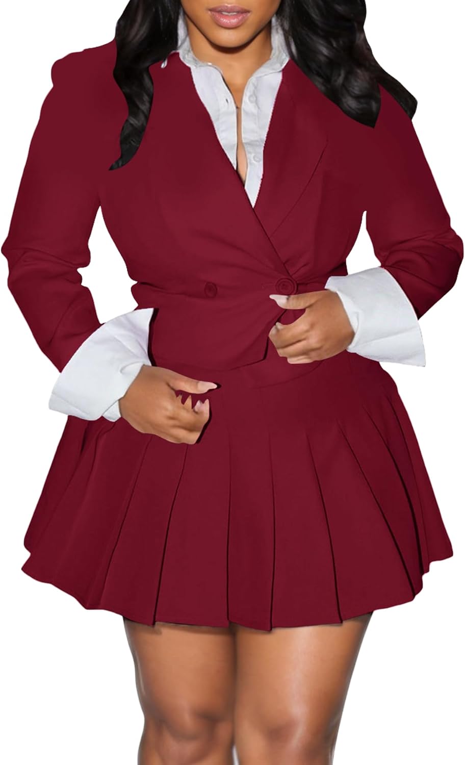 Womens Suits 2 Piece Set Casual Double Breasted Crop Jacket Blazer Top & High Waist Pleated Mini Skirt Sets