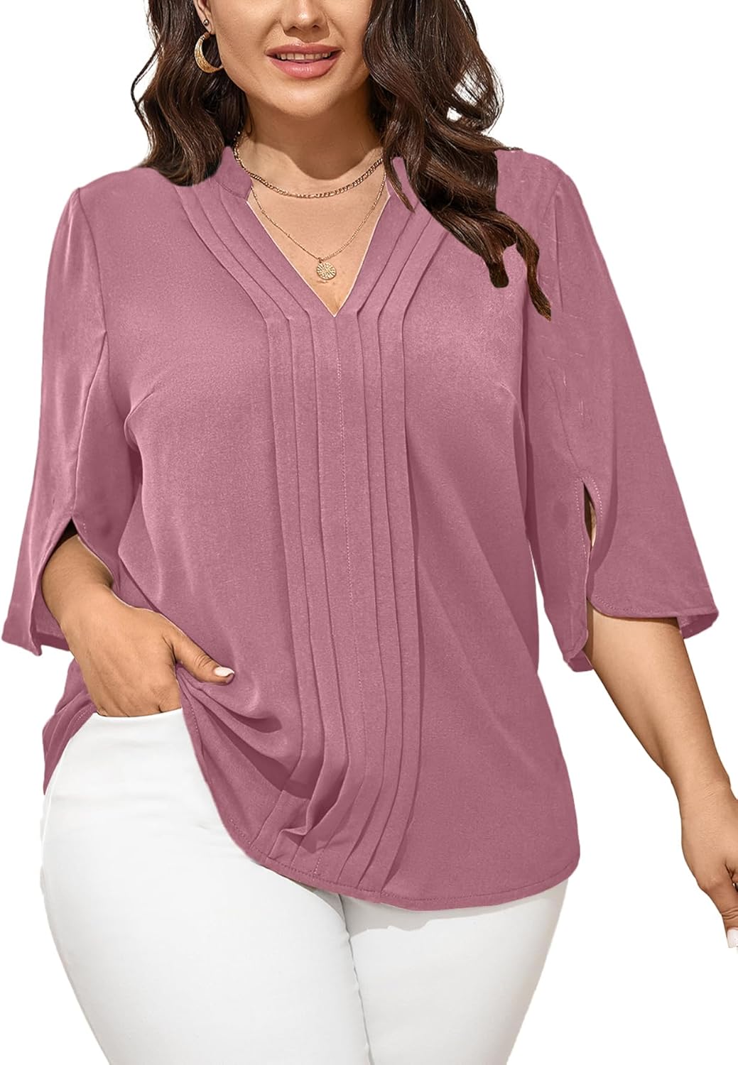SCOMCHIC Women's Plus Size Blouses 3/4 Sleeve Dressy Tunic Tops Casual Loose V Neck Pleated Shirts
