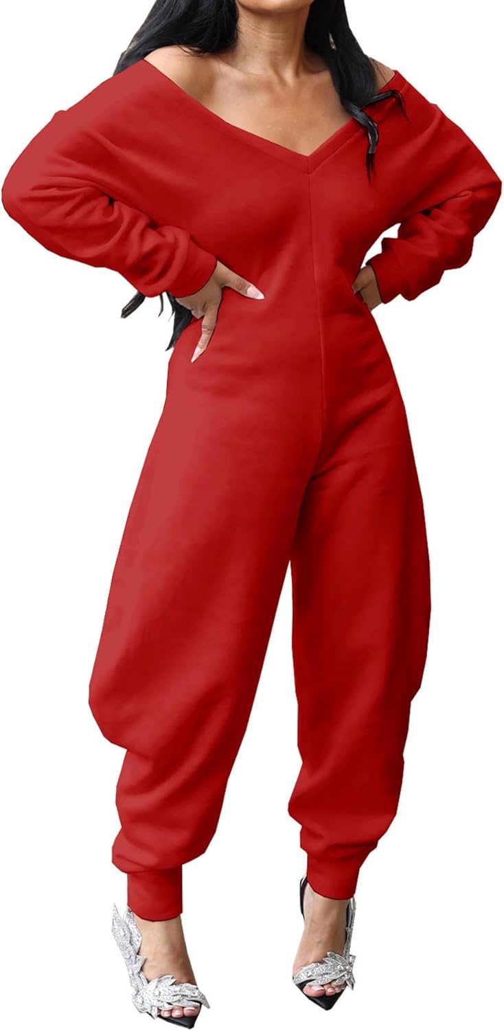 YOUFE Womens Sexy Solid Color Jumpsuit Comfy V Neck Off Shoulder Long Sleeve Wide Leg Romper Baggy Club Sweatsuit Outfit