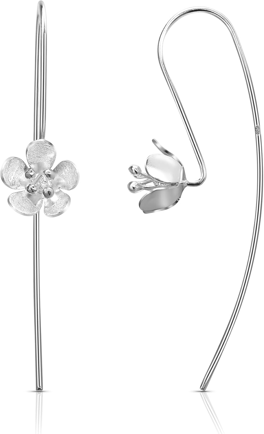 AeraVida Stunning Hibiscus Flower Blossom .925 Sterling Silver Slide-Through Dangle Hook Earrings | Classic Sterling Silver Slide-Through Dangle Earring for Women | Jewelry Gift