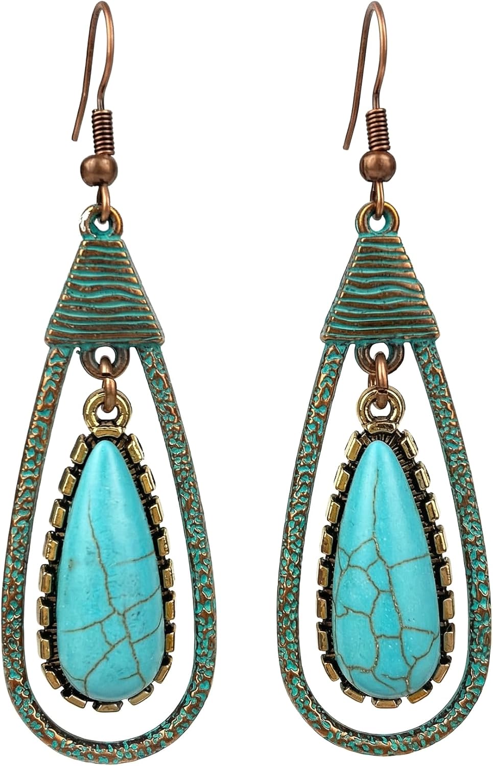 Turquoise Earrings, Vintage Bronze Natural Stone Dangle Earrings for Women, Teardrop Western Earrings Party Hippie Jewelry
