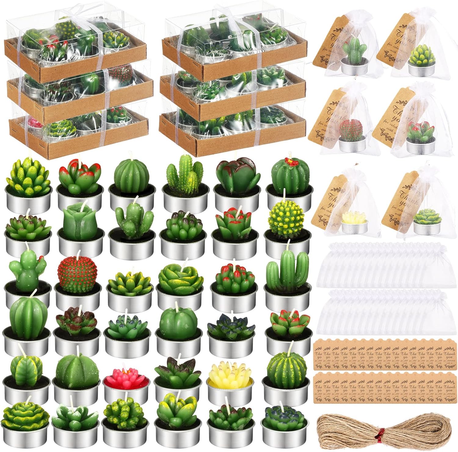Treela 36 Pcs Cactus Succulent Tealight Candles with 36 Organza Gift Bags and 36 Thank You Card Tag Decorative Cute Candles Gifts for Birthday Wedding Christmas Party Home Decor