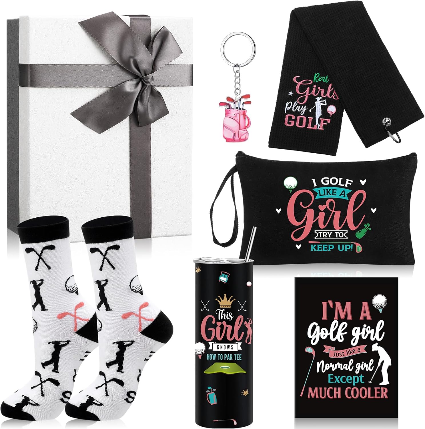 - Complete Golf Gift Set for Girls: this 7 pcs golf gift set is nice for any girl who loves golf; It includes a variety of accessories: an embroidered golf towel, golf themed socks, a makeup bag, a travel cup, a golf keychain, and a greeting card, all neatly packed in a gift box