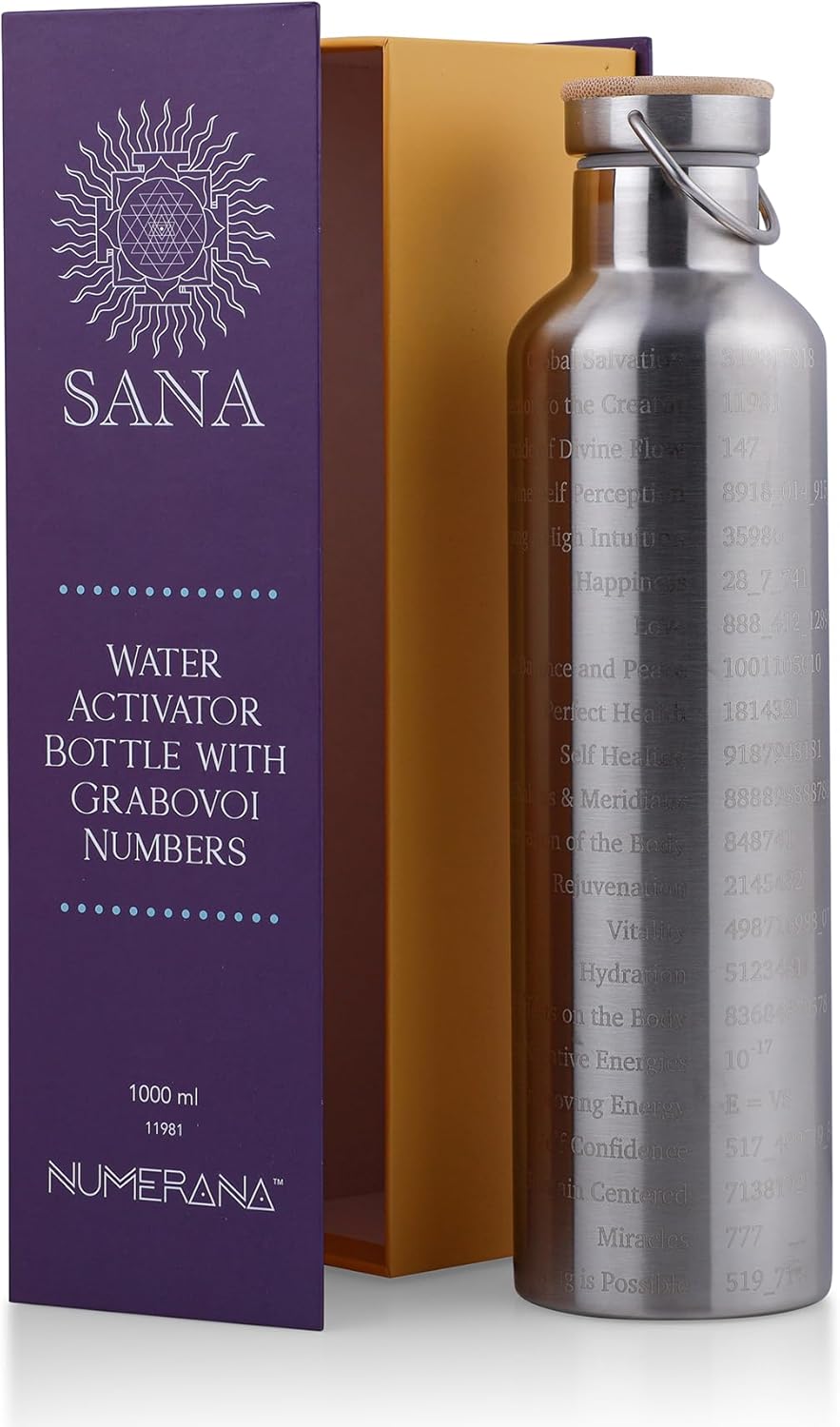 - Numerana Sana Grabovoi Water Bottle features 22 laser-engraved Grabovoi numbers designed to structure water and elevate its energetic frequency with every sip. Ideal for daily wellness seekers.