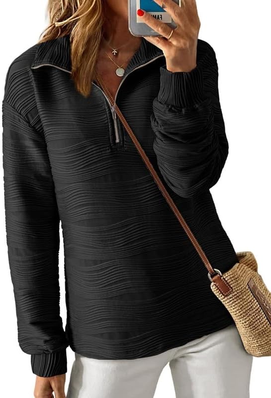 Dokotoo Women's Casual Half Zip Long Sleeve Pullover Shirts Solid Color Textured Sweatshirt Tunic Tops