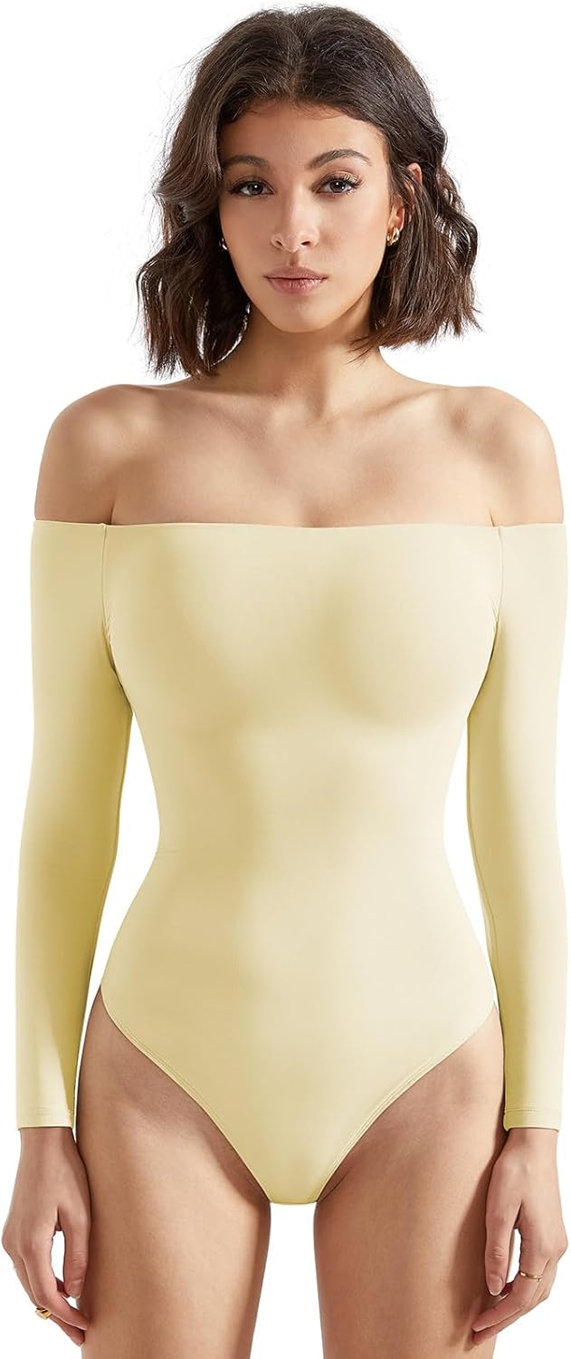 SUUKSESS Women Off the Shoulder Long Sleeve Bodysuit Double Lined Thong Bodysuit