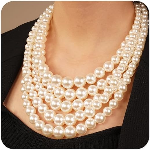 YERTTER Vintage 1920s Pearl Necklace Earrings Bracelet Set Multi layered Strand Chunky Pearl Choker Statement Collar Neck Hand Accessories Gift for Her (A)