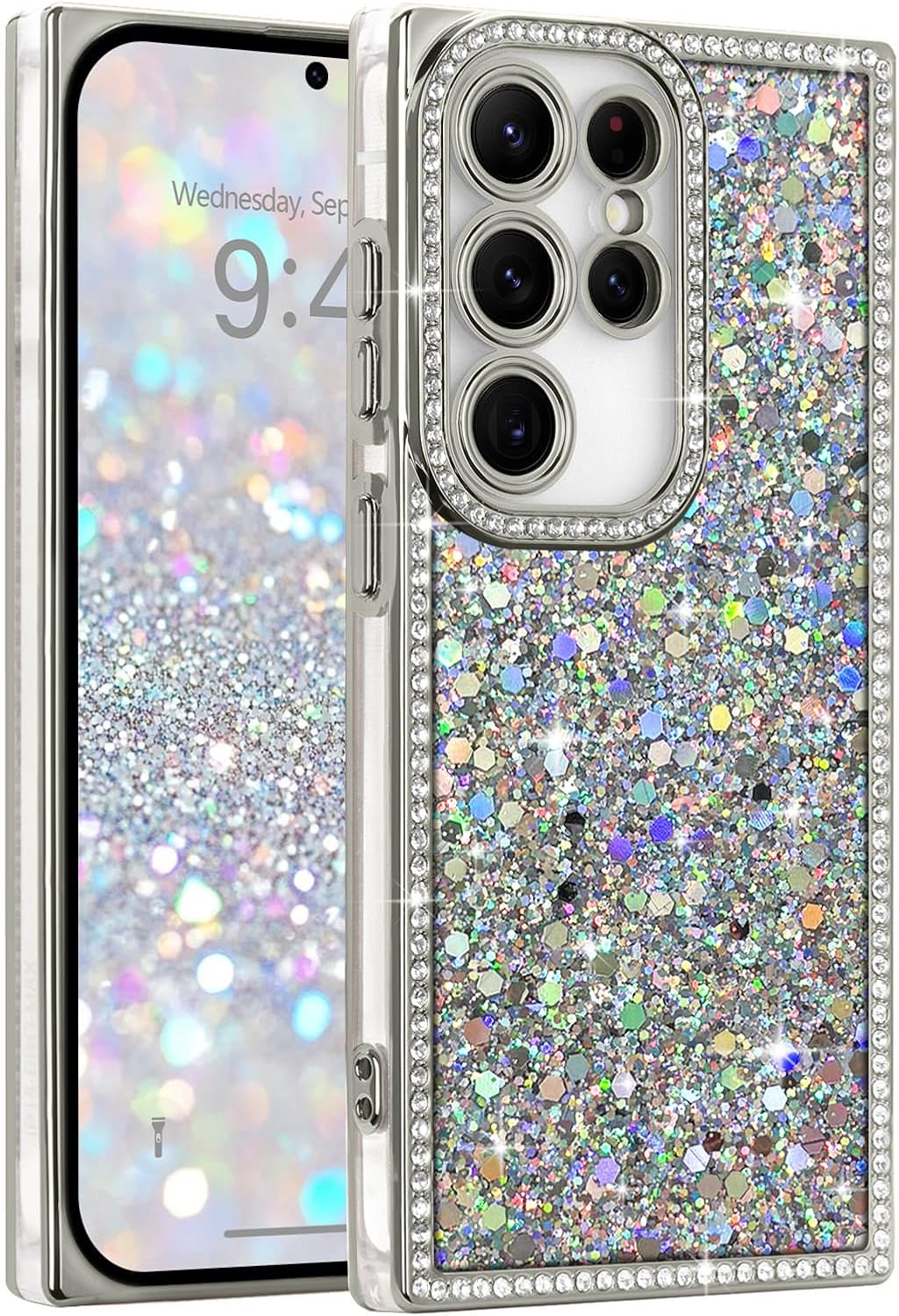 LAPOPNUT for Samsung Galaxy S25 Ultra Case,Glitter Sparkly Crystal Diamond Rhinestones Rectangle Edge Phone Case for Girls Women,Cute Bling Sequin Shockproof Raised Camera Protection Cover,Silver