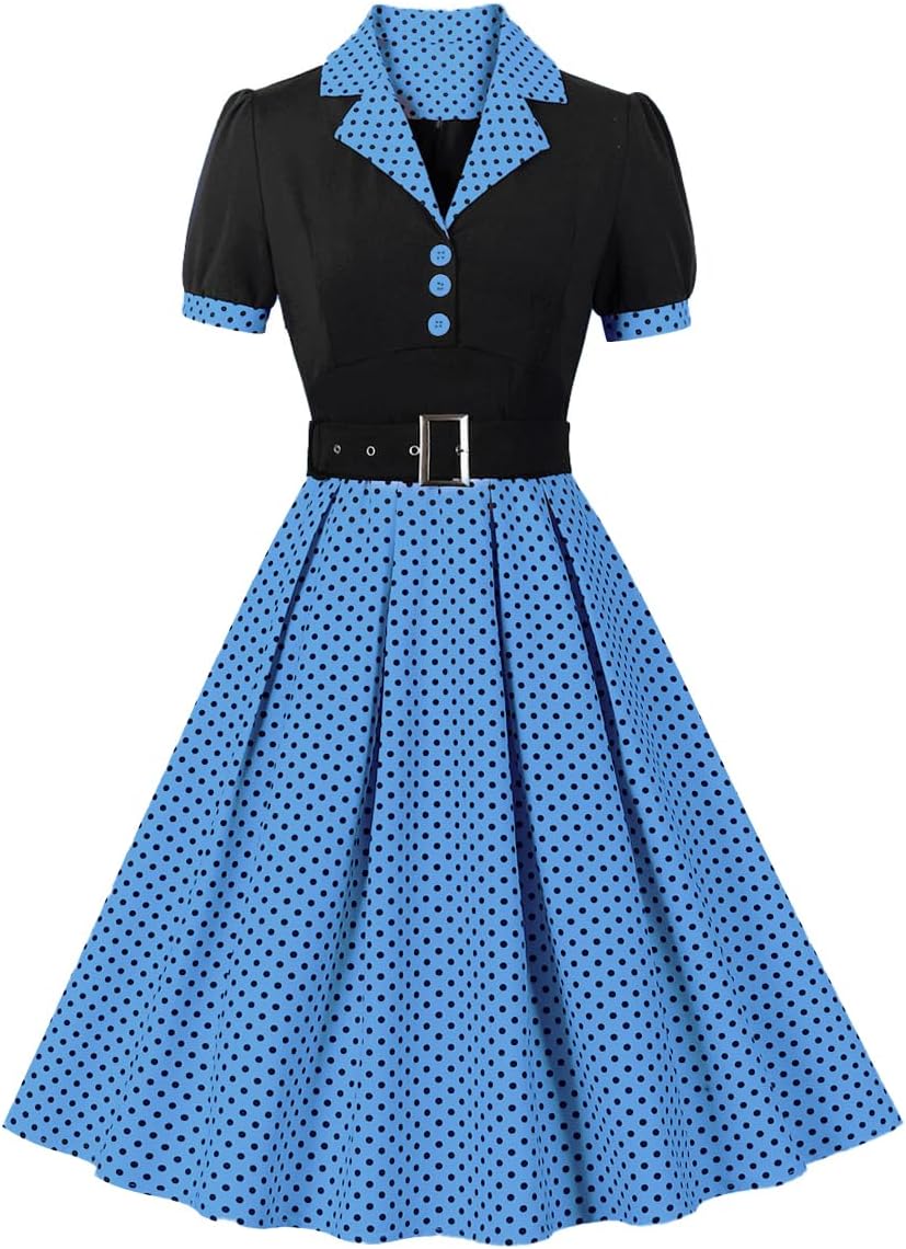 ODIZLI Women's 1950s Retro Dress Short Sleeve Notched Lapel Polka Dot Stripe Swing Dress with Belt Cocktail Dress