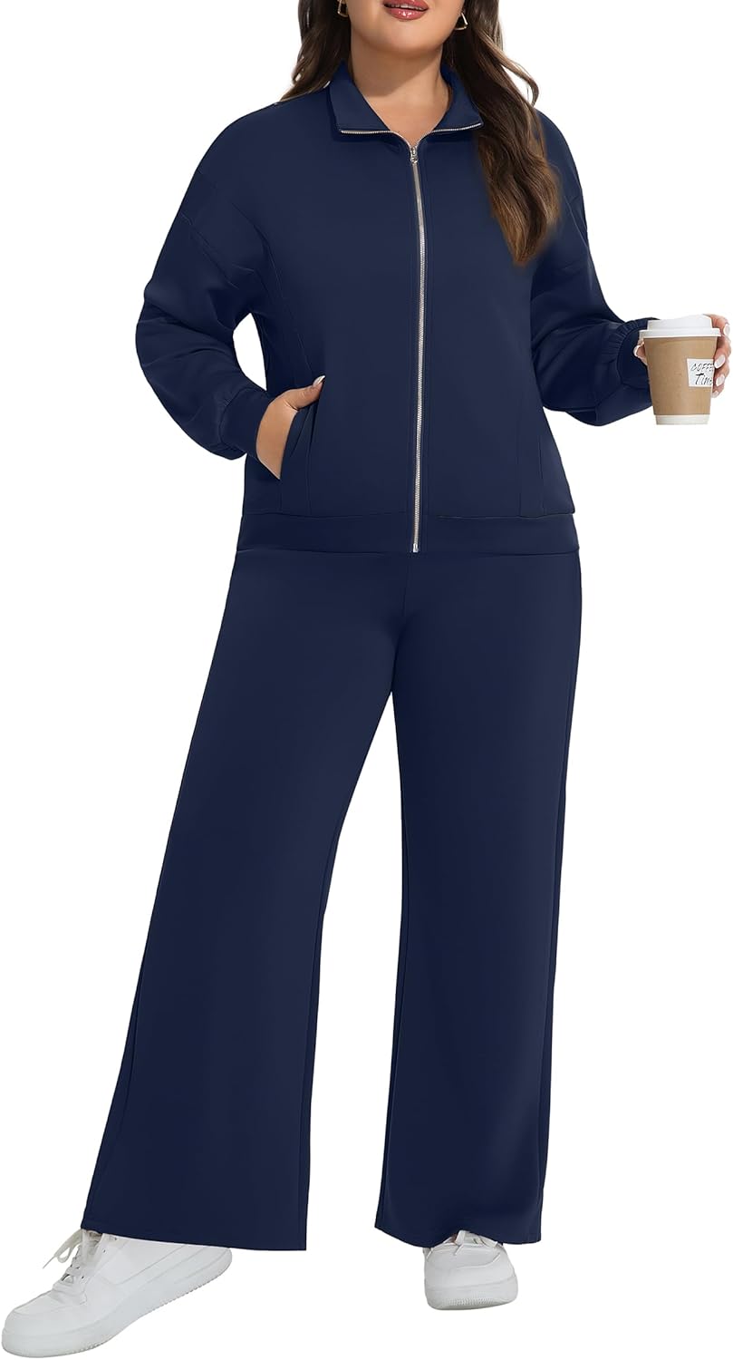 Plus Size Women 2 Piece Outfits Sweatsuits Zip Up Sweatshirt Wide Leg Sweatpants Lounge Set Casual Tracksuit