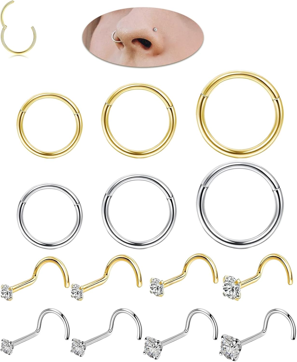 18g Gold Nose Rings and 20g Nose Studs Sets for Women Men, Hypoallergenic 316L Surgical Stainless Steel Corkscrew Nose Studs with 1.5/2/2.5/3mm CZ Piercings Jewelry 14Pcs (Gold & Silver)