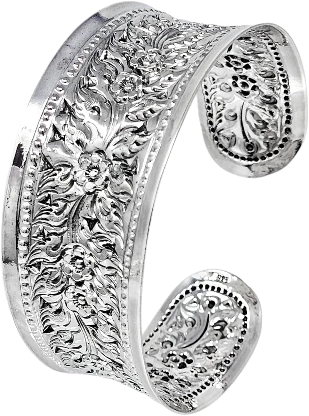 Women's Silver 25mm Wide Cuff Bangle Bracelet - Handmade 925 Sterling Silver Flowers Floral Bangle for Women