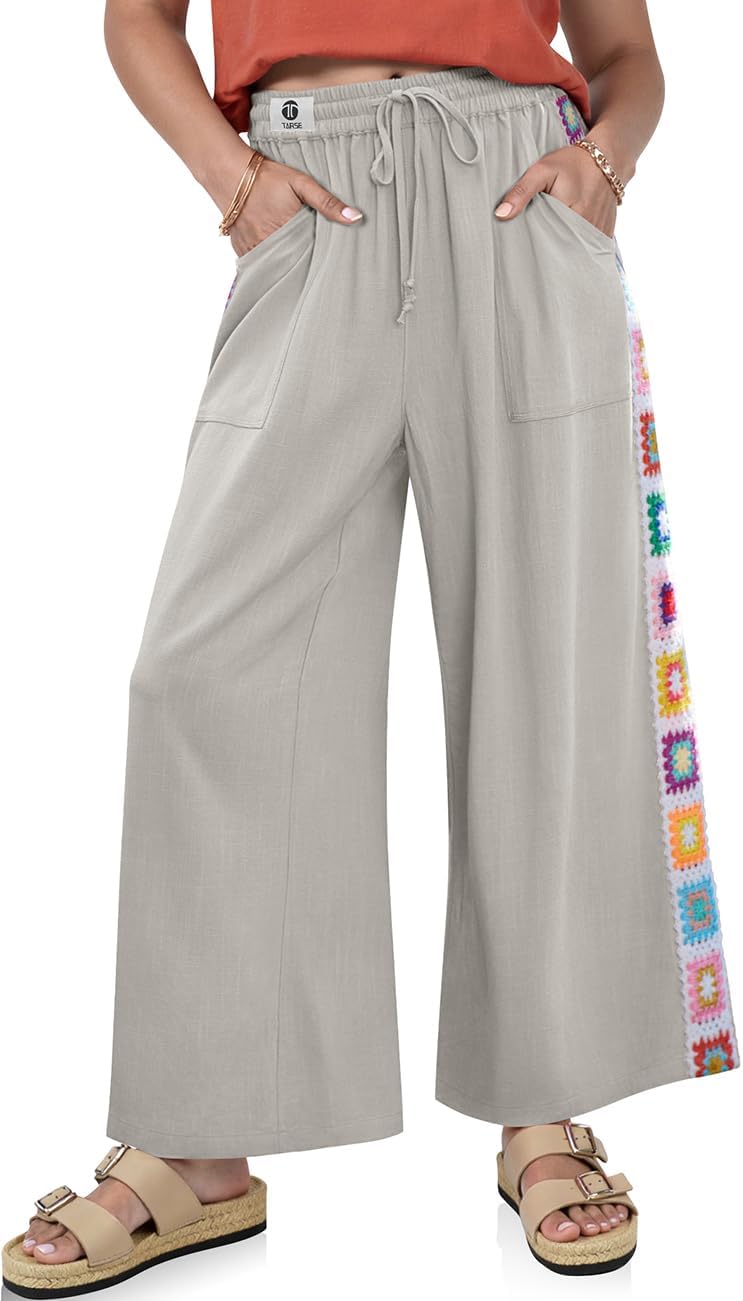 TARSE Womens Wide Leg Linen Pants Summer Casual Drawstring Loose Lounge Palazzo Crochet Panel Pant with Pocket
