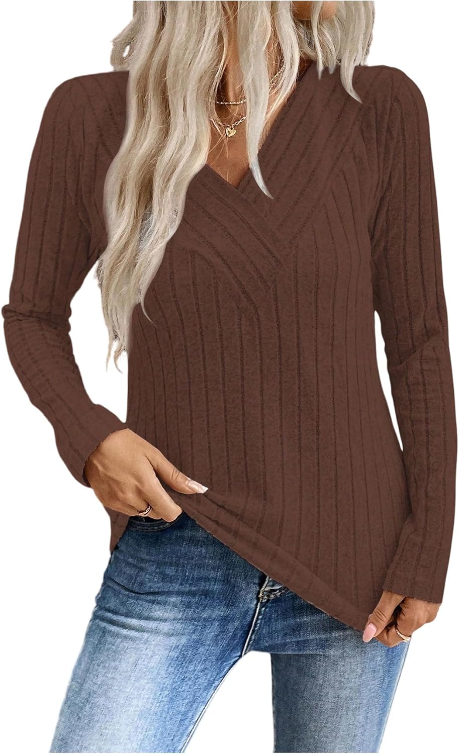 Women's Wrap V Neck T Shirts Fall Long Sleeve Ribbed Knit Dressy Casual Tops