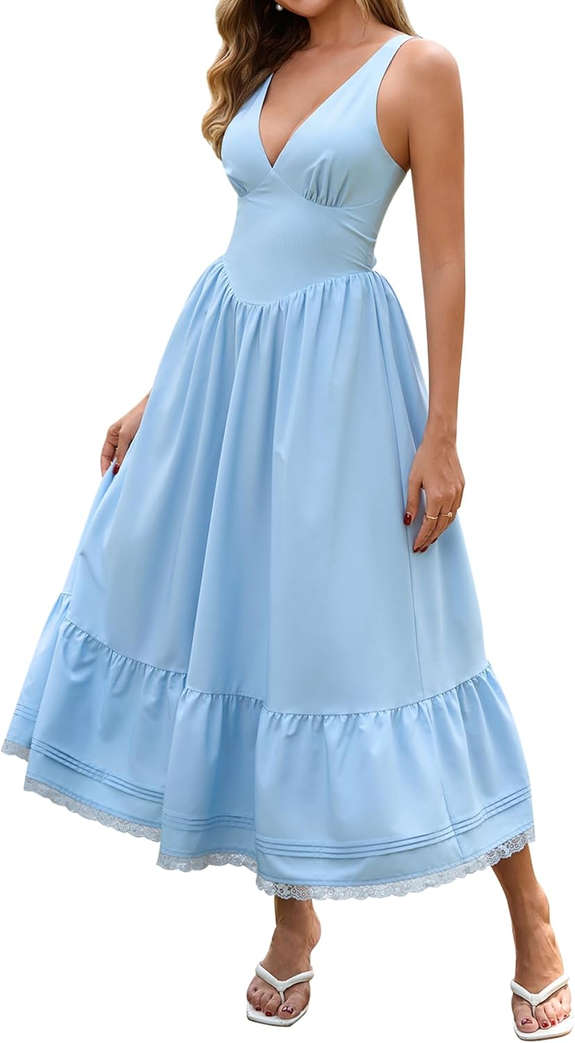 Floral Corset Midi Dress Casual V Neck Spring Summer Lace Flowy Sundress Wedding Guest Dresses for Women 2026