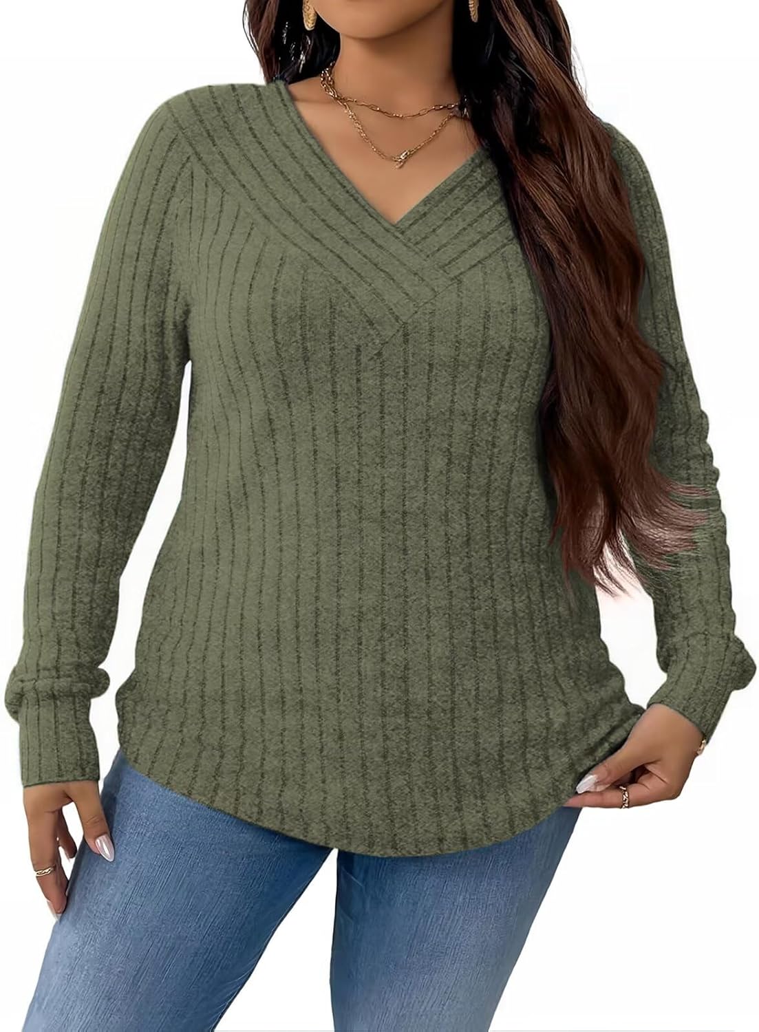 VISLILY Plus-Size-Sweaters for Women Trendy Long Sleeve V Neck Shirts Loose Lightweight Tops Casual Knit Pullover Tunics