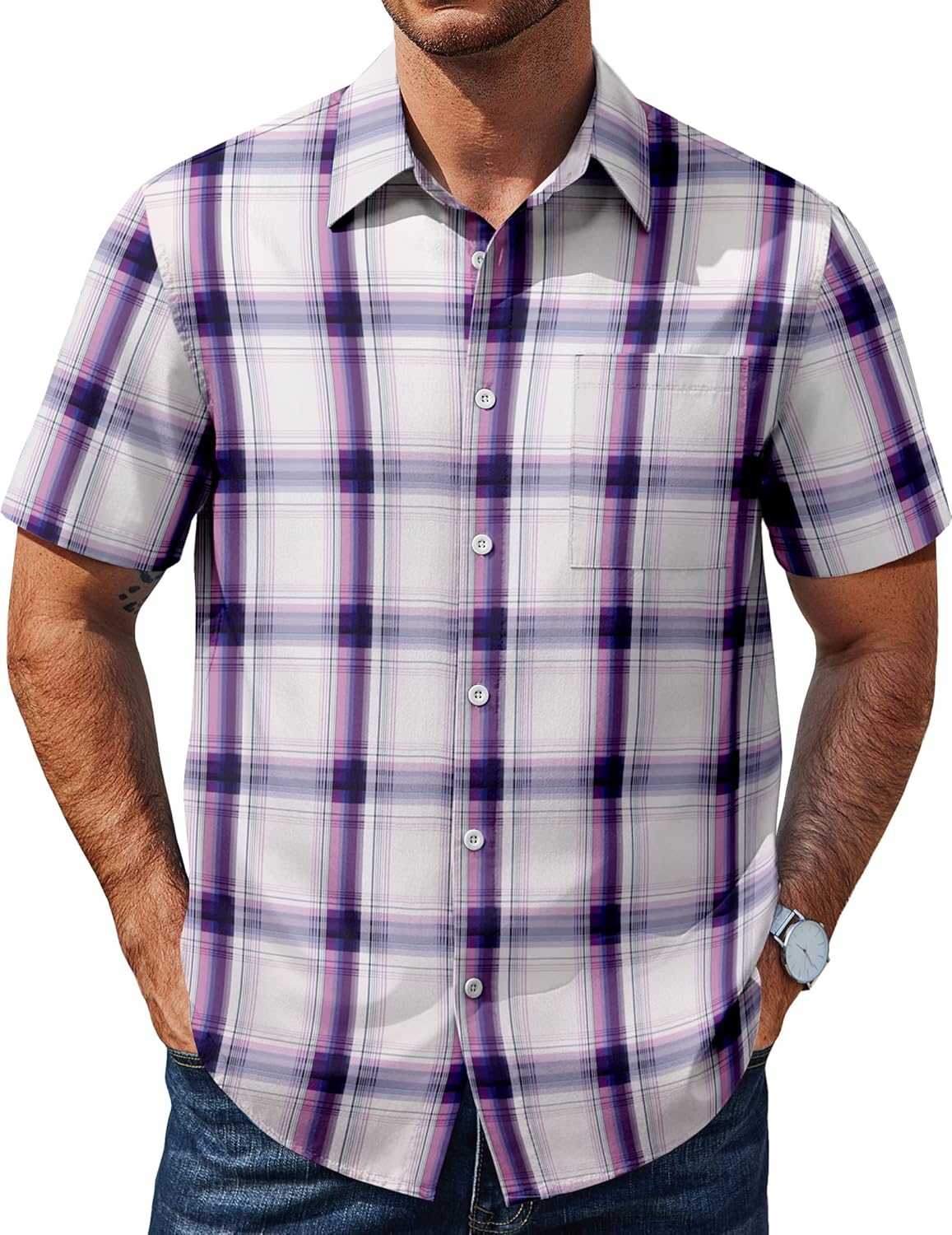 COOFANDY Mens Plaid Short Sleeve Button Down Shirts Regular Fit Casual Dress Shirts with Pocket
