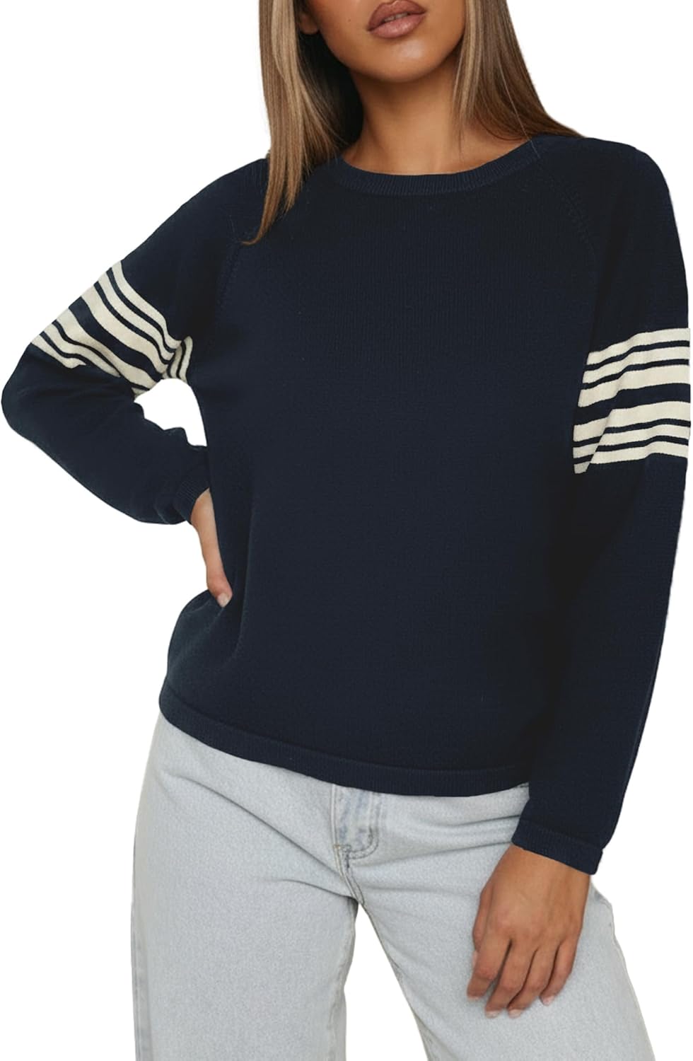 Womens Sweater Fall Long Striped Sleeve Pullover Sweater Casual Crew Neck Knit Jumper Tops(Petite)