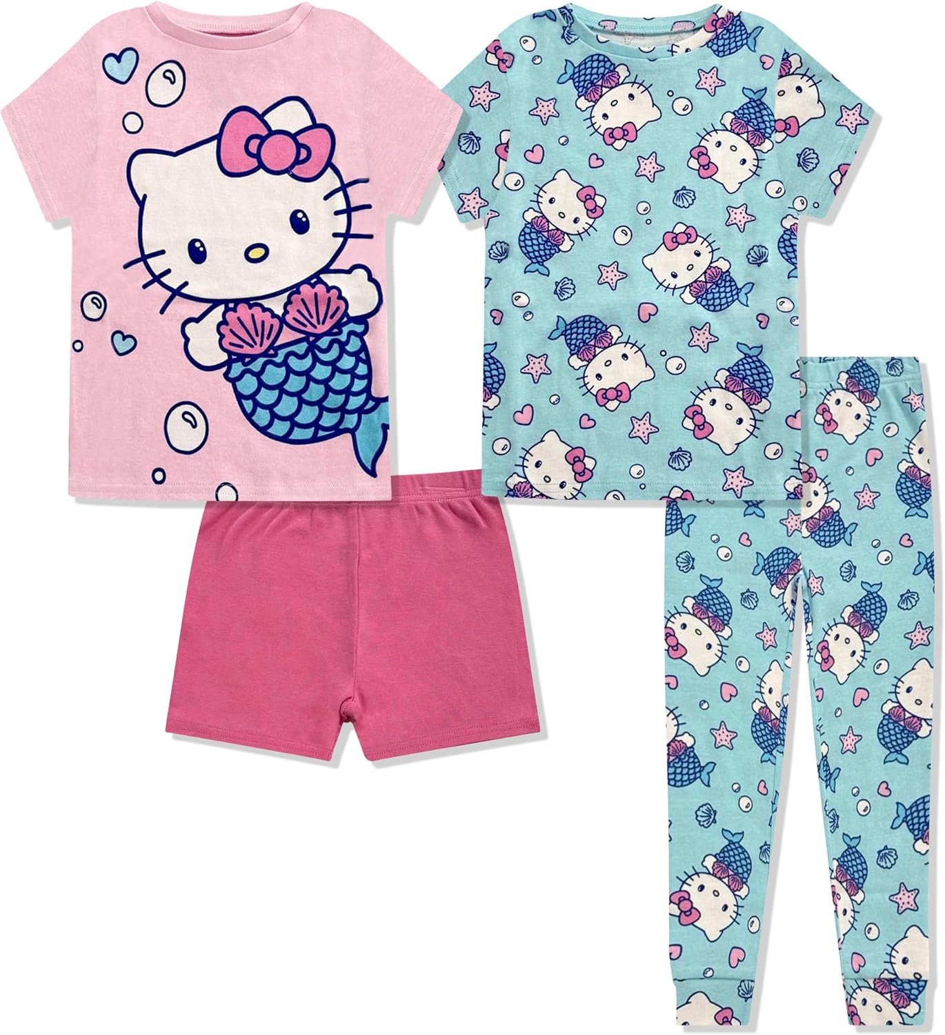 Hello Kitty Girls 4 Piece Pajama Set - Short Sleeve Shirt, Shorts & Pants - 100% Cotton Kids Sleepwear - Official License