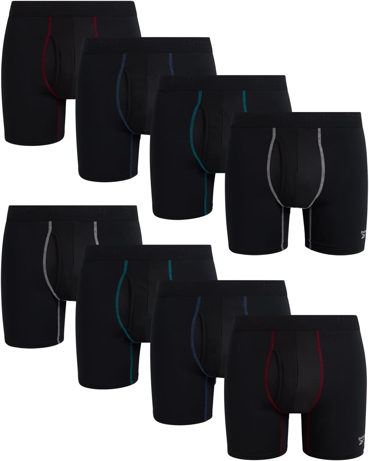 Reebok Mens Boxer Briefs - 8 Pack Performance Stretch Mens Underwear Boxers with Functional Fly, 6" Inseam Boxers for Men, Size Small, Black