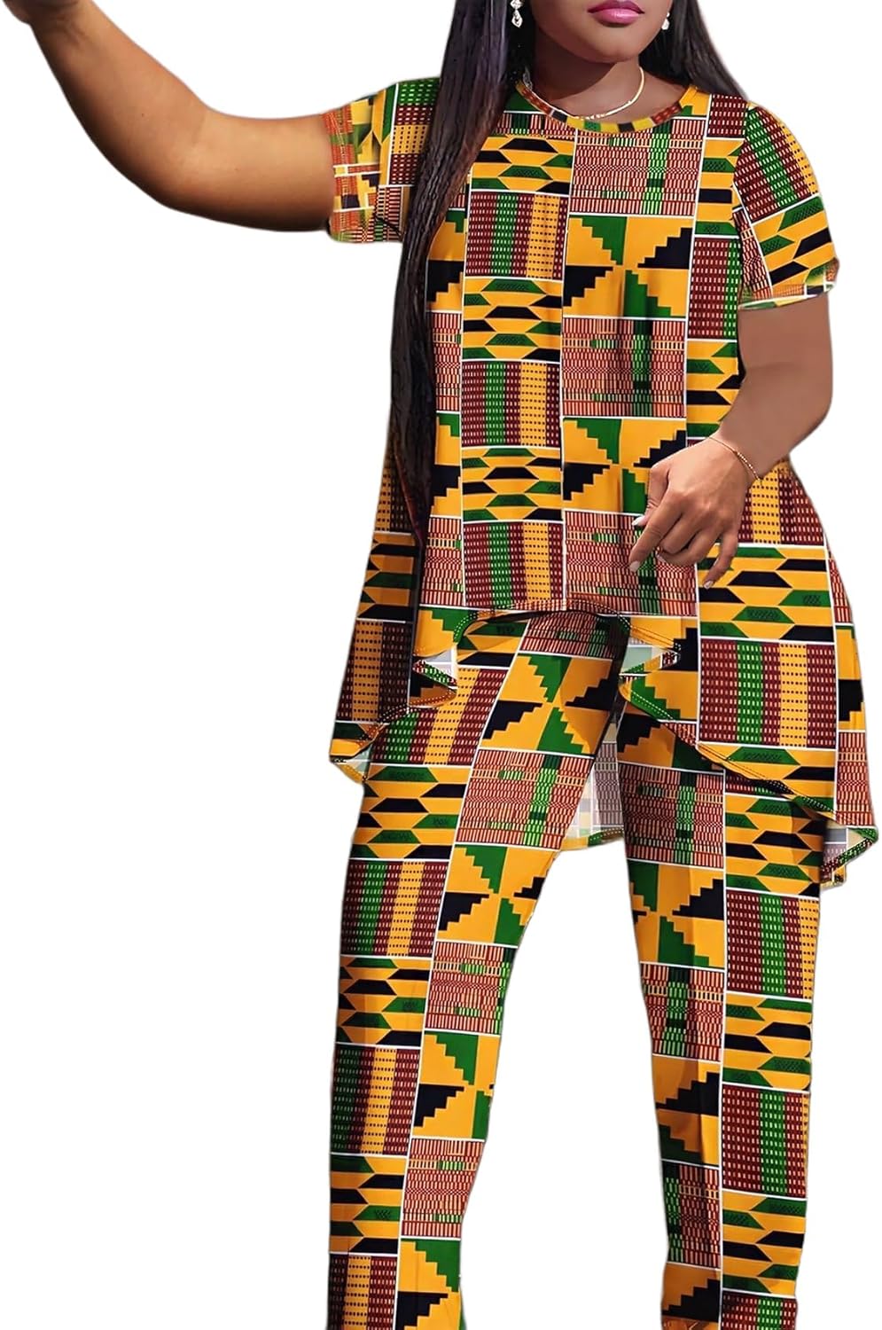 African Print 2PC Set Short Sleeve Top with Wide Leg Pants Traditional Kente Pattern Plus Size Lounge Sets for Women