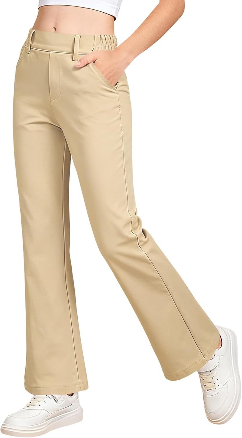 QBK Girls Flare Dress Pants Kids School Uniform Bell Bottoms with Elastic Waist for Teens Size 4-15 Years