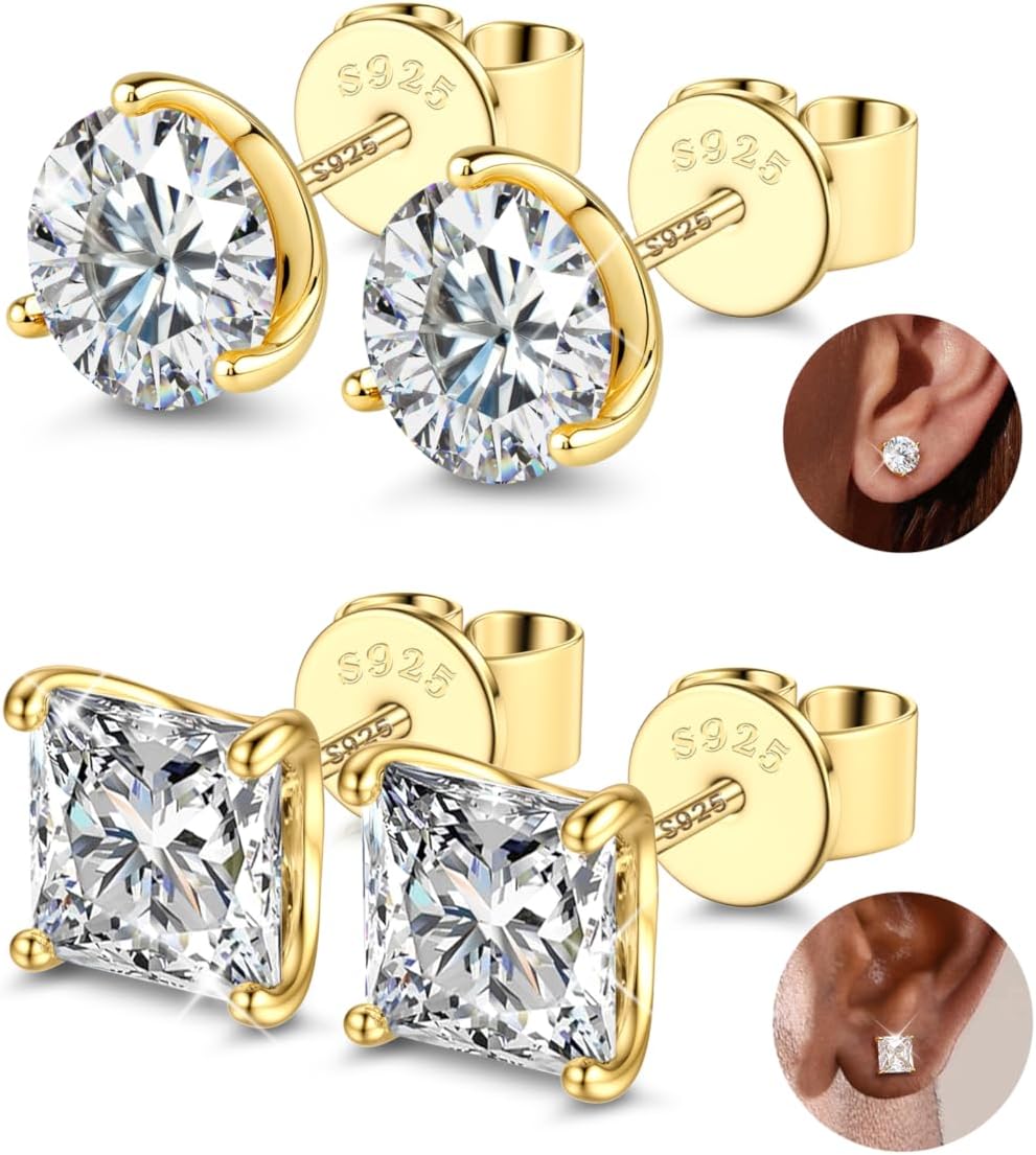 2 Pairs "STUNNING FLAME" 925 Sterling Silver 18K Real Gold Plated Stud Earrings for Women Men 5A Brilliant Princess Cut Round Cubic Zirconia - Hypoallergenic Large CZ Studs Earring Set 8 CTW (2ct*4)