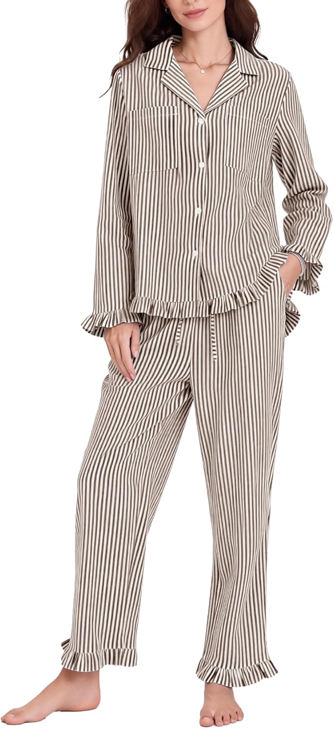 Flygo Womens Striped Pajama Sets 2 Piece Cotton Lounge Sets Button Down Top Straight Leg Pants with Pockets Y2K Pjs Sleepwear