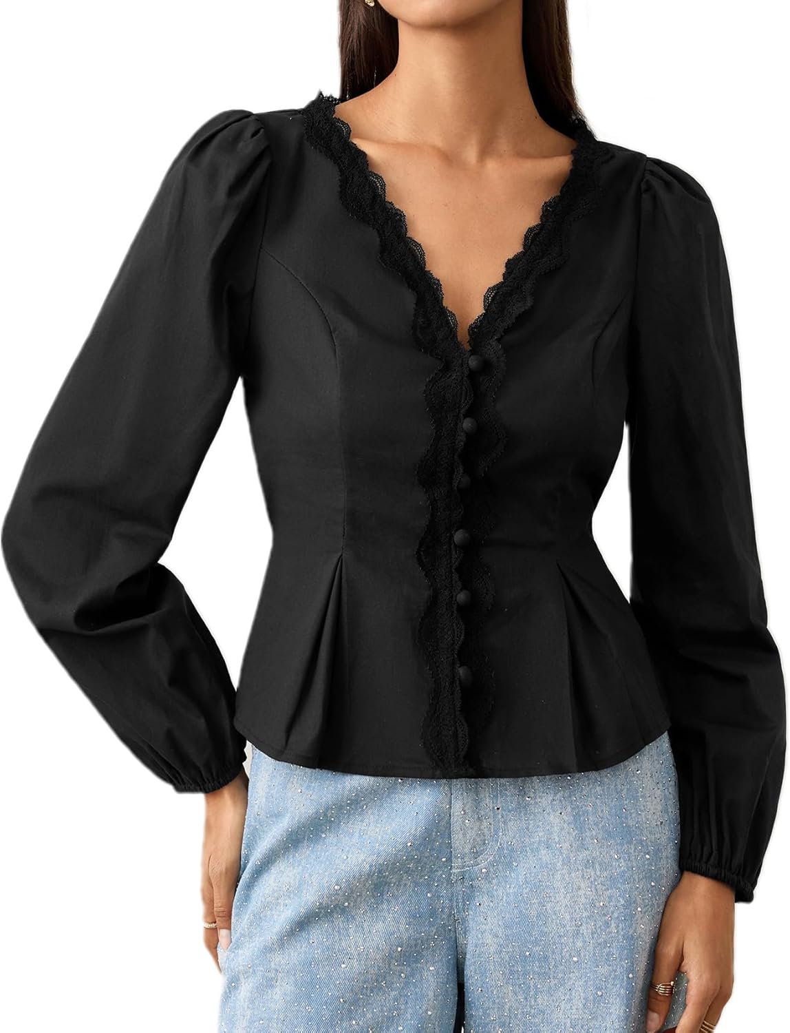 Women Blouse Lace Button V-Neck Shirt,Long Puff Sleeve Tie-Waist Cute Top