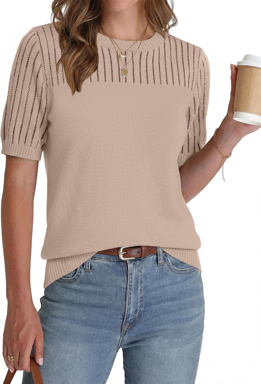 Zeagoo Women's Short Sleeve Sweater Tops 2026 Spring Summer Crew Neck Hollow Out Blouses Dressy Business Casual Outfits