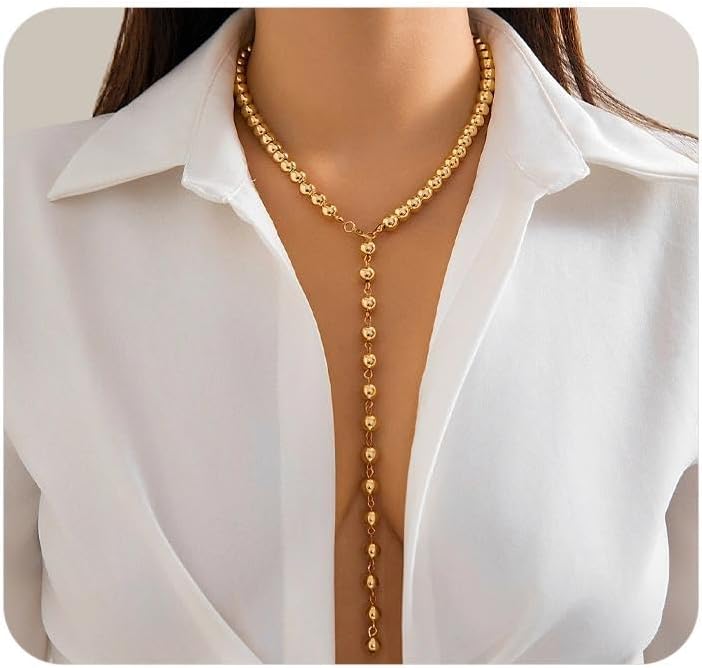 Vintage Gold Round Beaded Lariat Necklace for Women,Dainty Long Y-Shaped Statement Pendant Necklace,Personalized Trendy Jewelry Accessories Gift