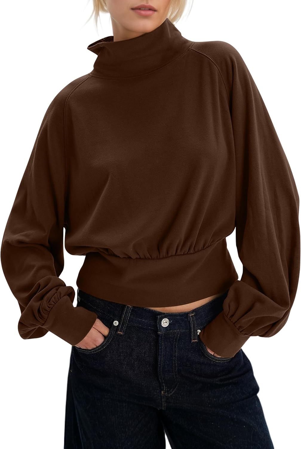 Ythomm Women Mock Turtleneck Crop Sweatshirt Long Balloon Sleeve Ruched Banded Bottom Pullover Blouson Top Shirt Fall Clothes (Brown, Large)